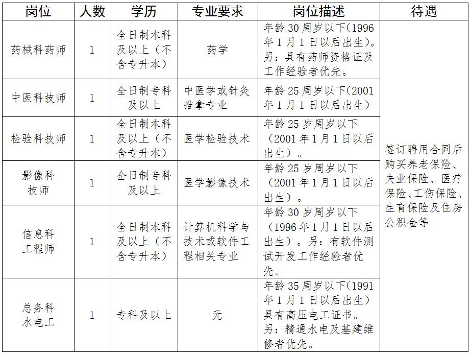 新进人员均实行合同聘用制,聘用期限按医院相关规定执行;薪酬待遇参照医院同类合同制工作人员标准执行,享受医院规定的相关福利。