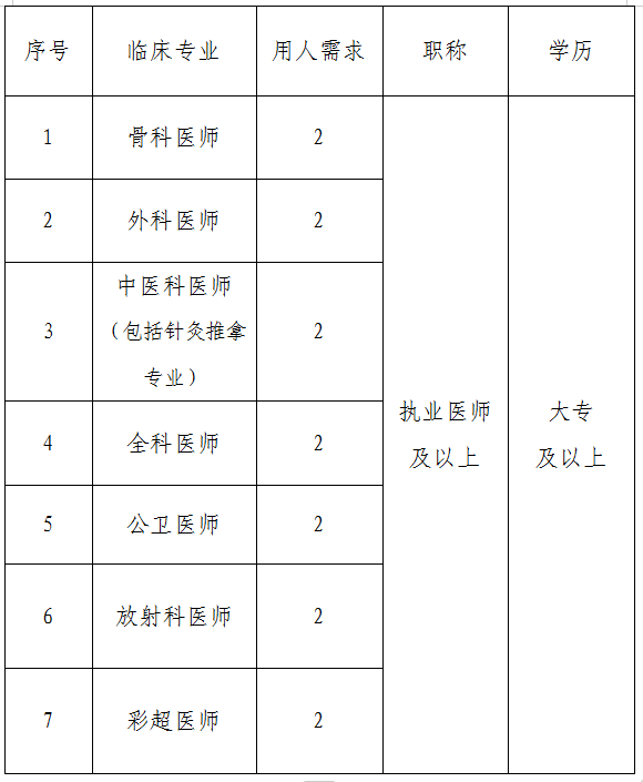 现根据医院业务发展需要,需招聘专业技术人员若干,现将有关事宜公告如下: