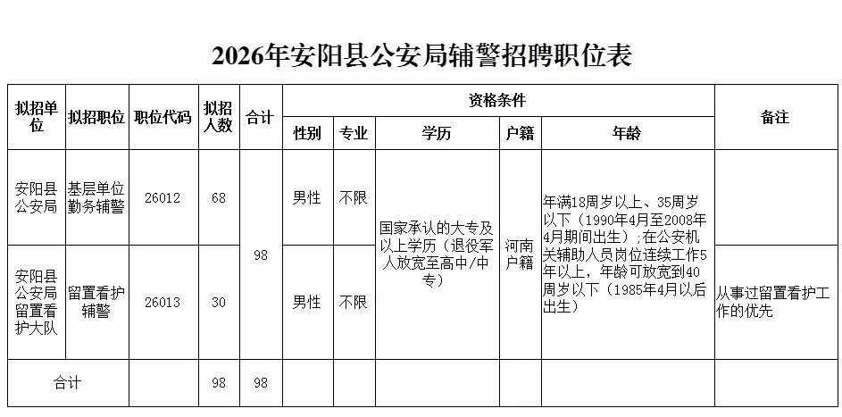安阳县公安局基层单位勤务辅警68人、安阳县公安局留置看护勤务辅警30人。